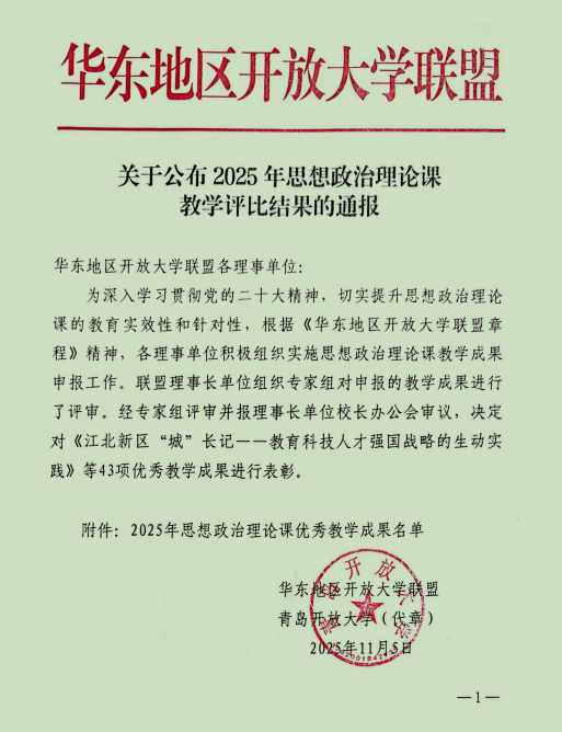 11 月初,华东地区开放大学联盟2025年度思想政治理论课教学成果评选活动落下帷幕。经过层层评审,我校表现突出,荣获一等奖1项、二等奖1项、三等奖2项及优秀奖1项,为学校在开放教育思政领域再添亮眼成绩。