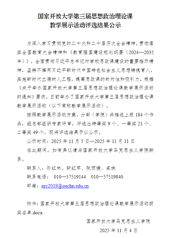 国家开放大学公示了第三届思想政治理论课教学展示活动获奖名单,董波、李欢欢、孙佩瑜、李爱红团队的《小窗口·大战略--从“江北新区”透视教育科技人才强国战略》荣获一等奖;张蓉、姜慧、李玲玲团队《改革创新赋能乡村蝶变一条邮路彰显为民初心》和刘茜、许红梅、冷雅琳、豆勇超团队的《传承中华优秀传统文化 推动中华文明守正创新》荣获二等奖;南京分部荣获优秀组织奖。